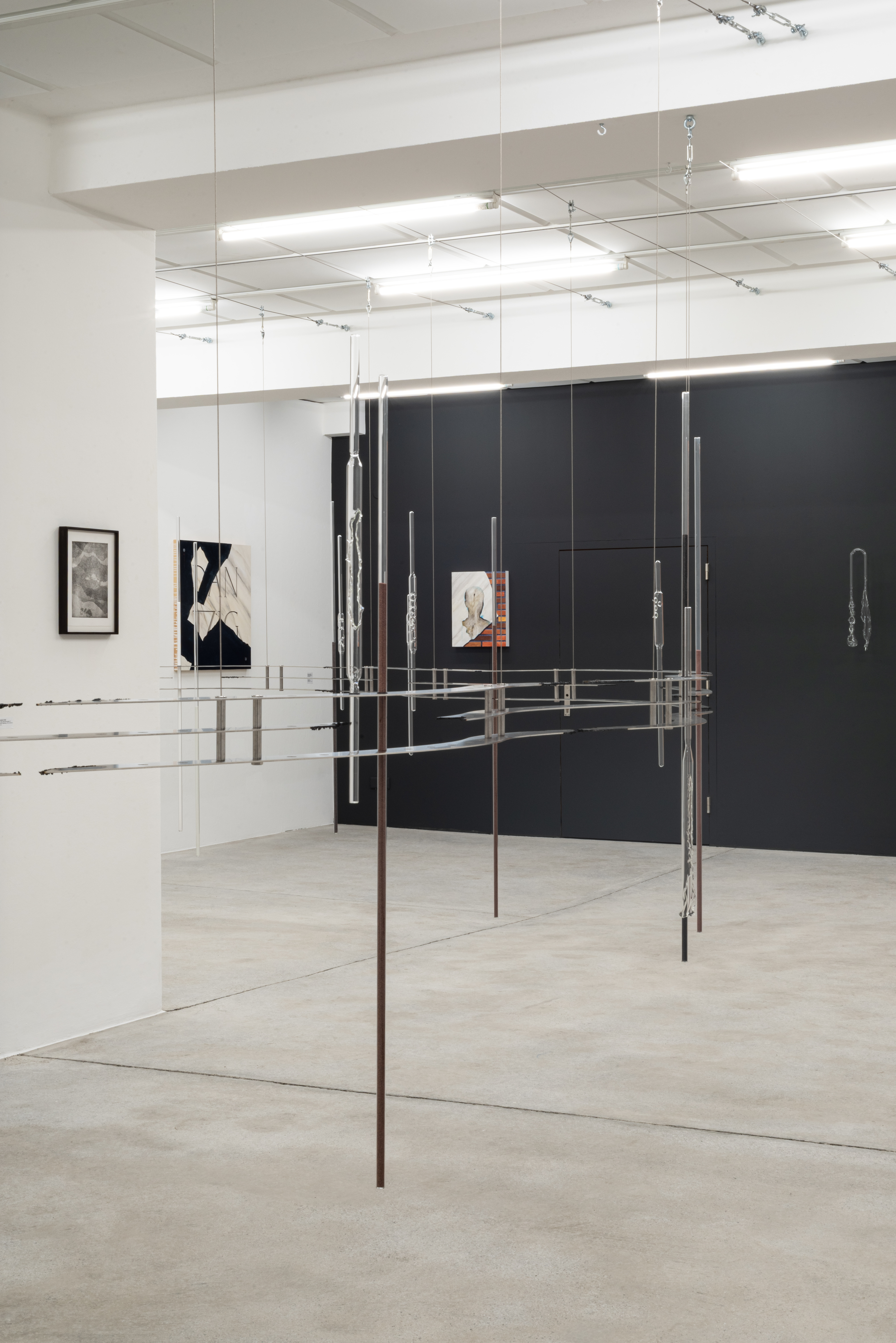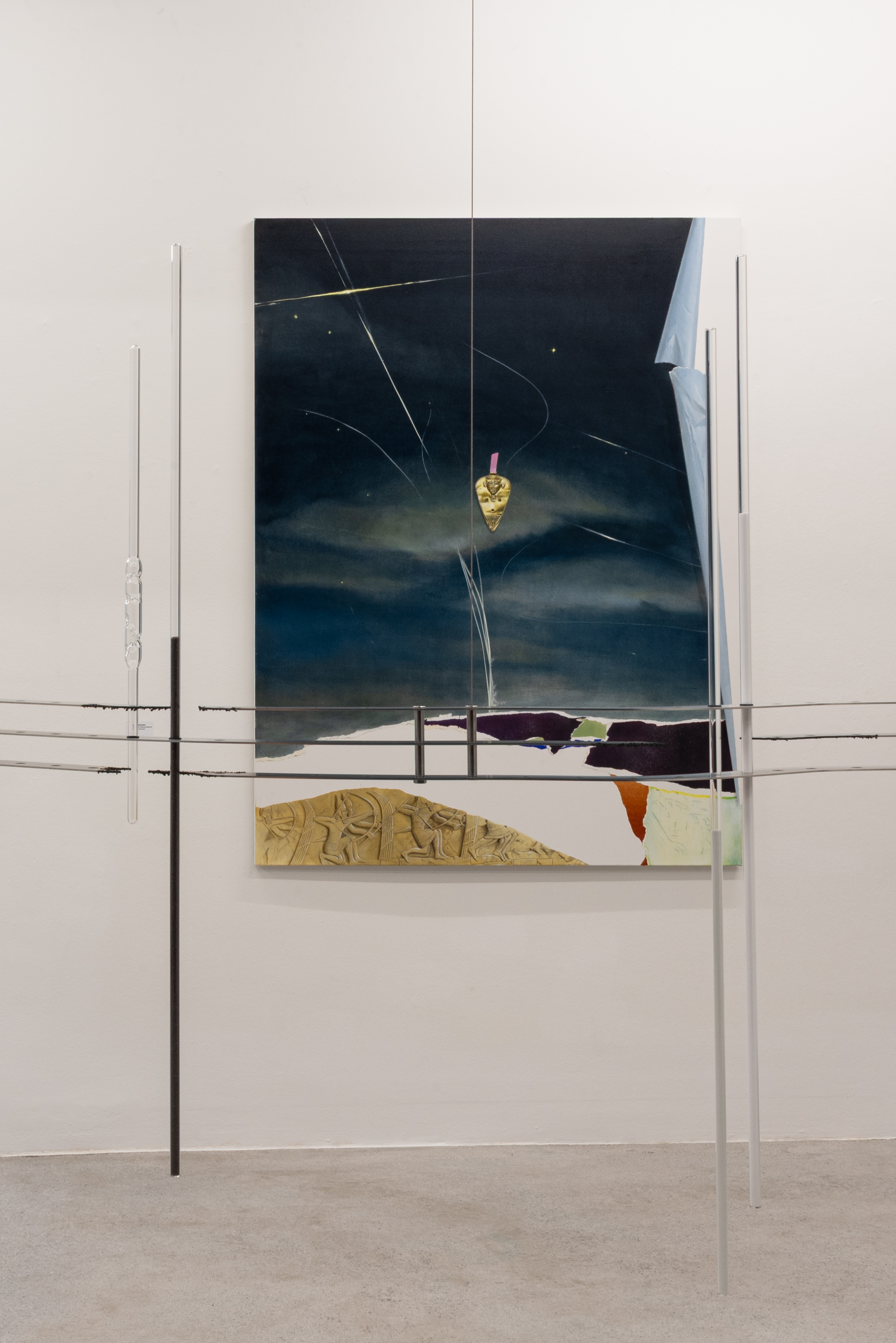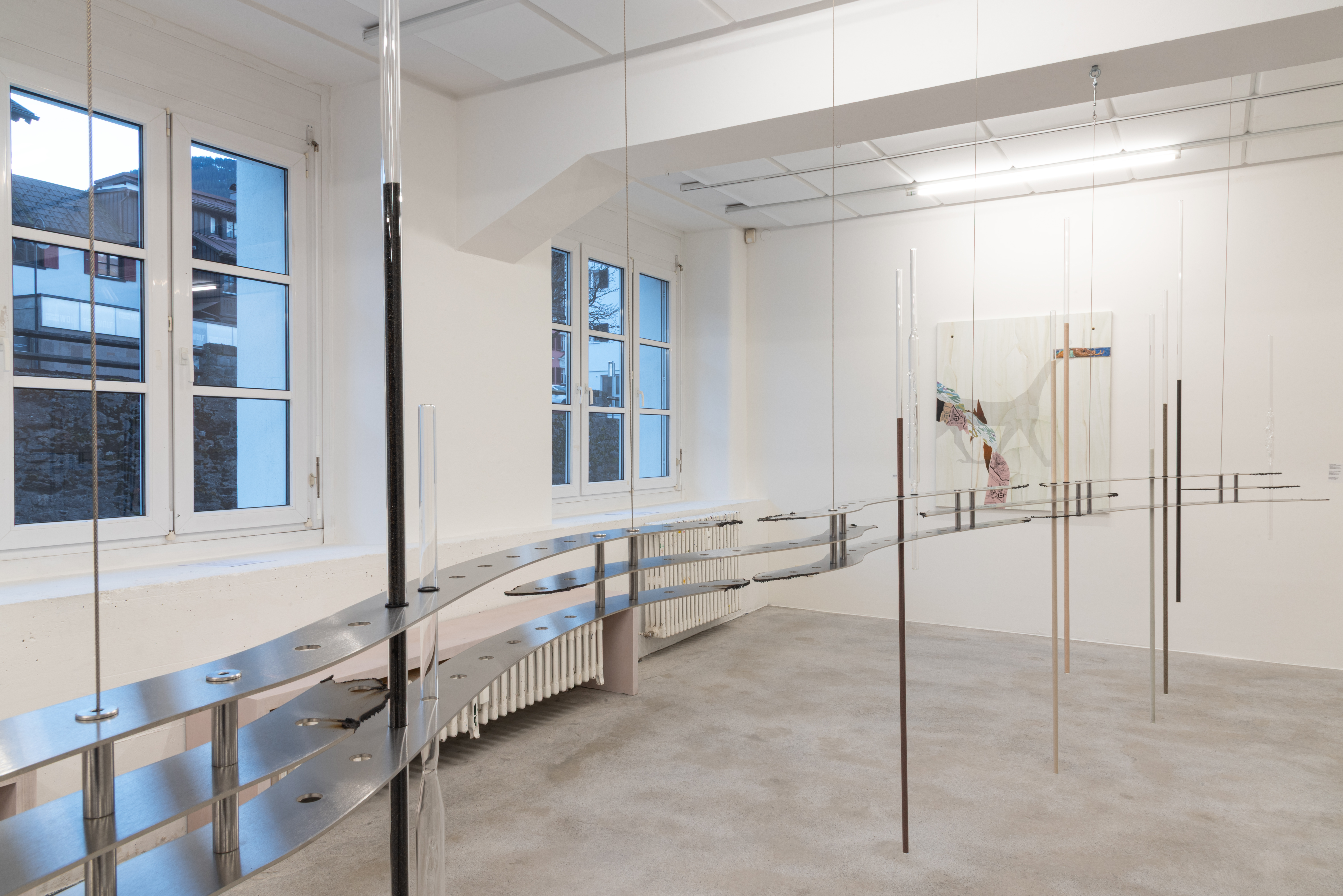 Bianca Phos’ interdisziplinäre Praxis untersucht, wie sich in organischen, technischen und geologischen Materialien Formen von Verletzung, Speicherung und Transformation einschreiben. In ihrer für das Kunstforum Montafon entwickelten Rauminstallation wird Materie selbst zum Akteur: Eine schlangenartige Metallstruktur folgt der Kontur des Nördlinger Ries – einer topografischen Narbe eines 14,6 Millionen Jahre alten Meteoriteneinschlags. In mundgeblasenen Glasröhren sind verschiedene Sande aufbewahrt – industrielle Silikate natürlichen sowie künstlichen Ursprungs, wie sie in der Sandstrahltechnik zur abrasiven Bearbeitung von Oberflächen eingesetzt werden. In den Röhren verdichten sich Glas und Sand zu sedimentierten Materialkörpern im Übergang: zugleich zerriebenes Gestein, kosmischer Rest und technisches Werkzeug. Auch die aus Sandpapierfragmenten geätzte Radierung erscheint wie eine Landschaft aus Abrieb, Berührung und Materialverschiebung. In all diesen Elementen wird Sand zu einem instabilen Gefüge aus Speicher, Fragment und Drift, in dem geologische Vergangenheit, industrielle Bearbeitung und potenzielle Zukunft ineinander übergehen und sich unaufhörlich neu ordnen.